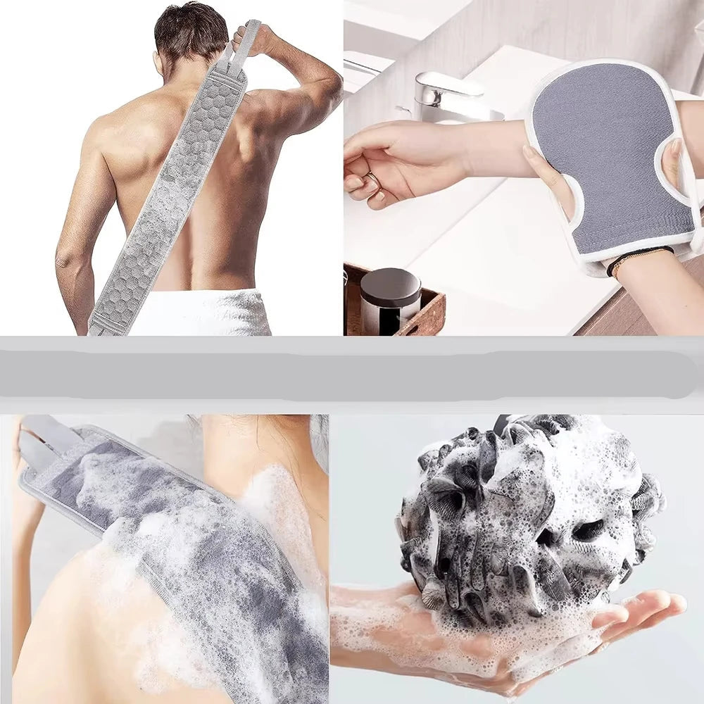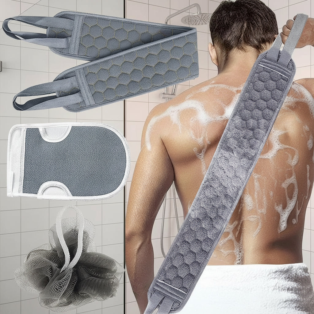 Un set de 3 outils de bain, parfait pour prendre de super douche hygiénique. Le set est composé d'une fleur de douche, une longue éponge épurateur de dos, et enfin d'un gant exfoliant pour profond et rafraîchissant de la peau à chaque lavage.